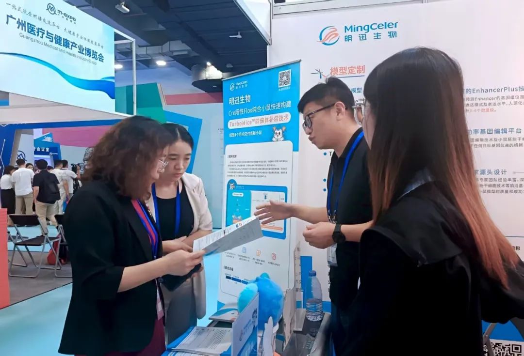 在会议召开期间,广州市卫生健康委员会领导也亲临展区参观了解,对明迅生物的TurboMice™四倍体补偿技术及基因编辑小鼠模型表现出了浓厚的兴趣,详细了解了相关技术的原理、优势以及应用前景,并对明迅生物在动物模型技术研发领域取得的成果表示认可。