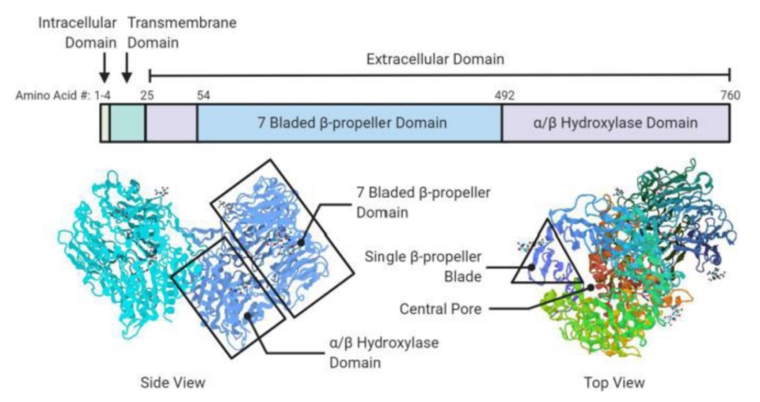 FAP由760个氨基酸构成,可划分为三个主要结构域:一个较短的胞内结构、跨膜结构域,以及功能性的胞外结构域。胞外结构域包含两个关键功能亚基:七叶β-螺旋桨结构域和α/β水解酶结构域。β-螺旋桨结构域由七个叶片围绕中央孔道构成,起到"分子过滤器"的作用,选择性调控底物进入;而α/β水解酶结构域则包含催化活性中心。这种三维构象使FAP能够同时具备二肽基肽酶和内肽酶活性,并在与整合素等分子相互作用、形成同源/异源二聚体过程中发挥关键作用。