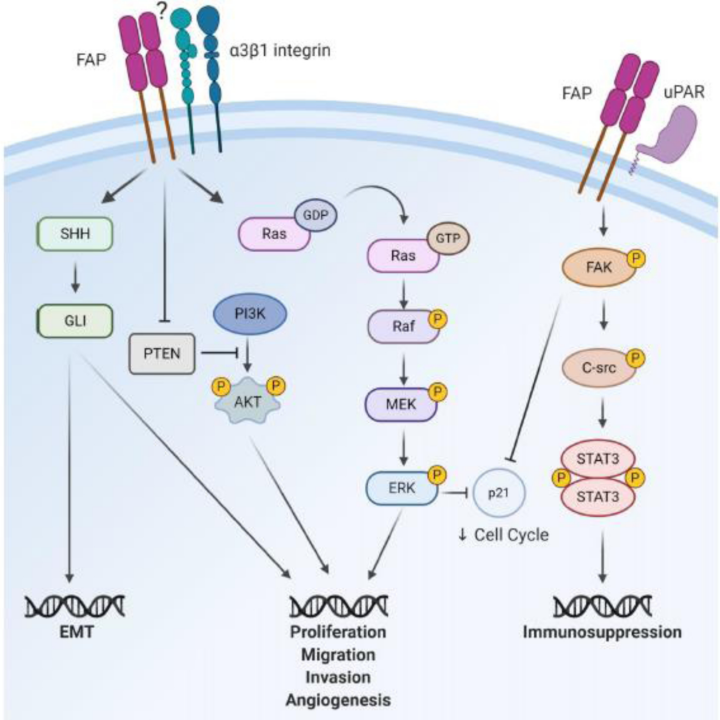FAP的表达能直接扰动癌细胞内的多条关键信号通路,从而影响细胞的增殖、存活和恶性转化。