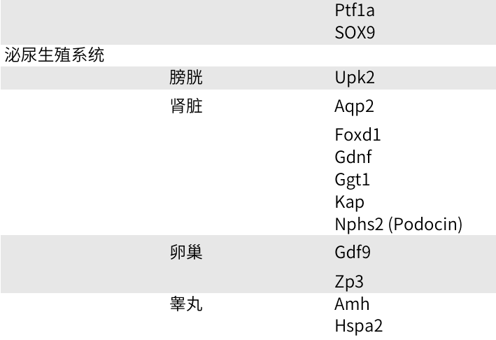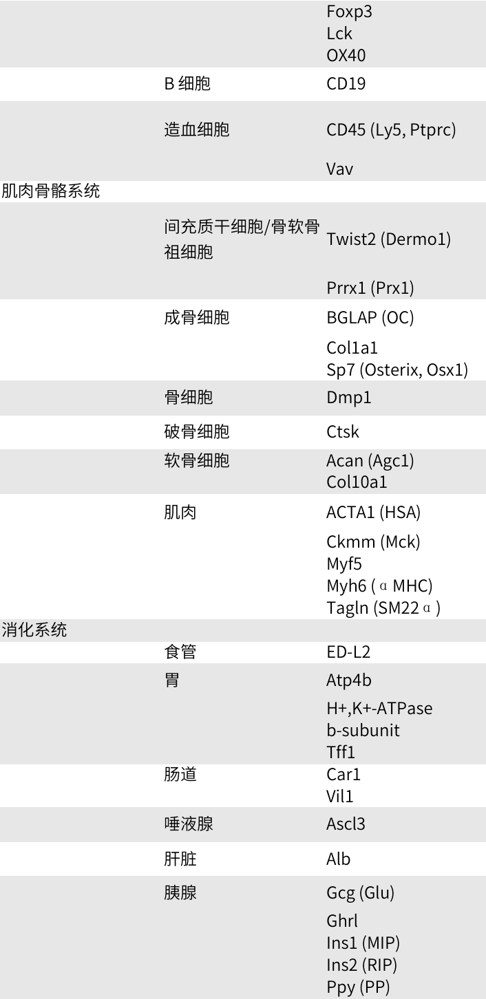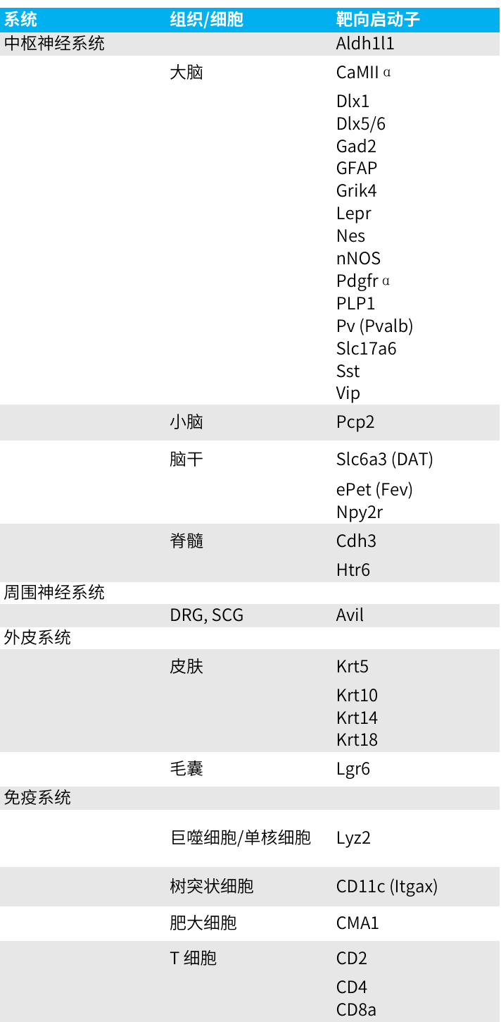 由于已经创建了许多器官特异性 Cre 和/或诱导型 Cre 转基因小鼠系。我们在下表中提供了一些最常用的组织特异性Cre启动子。